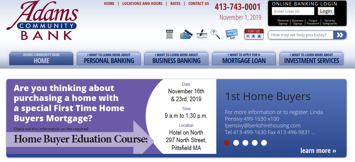 How to Access Your Adams Community Bank Account Online Adams Community Bank Online BankingĀ Adams Community Bank is a local bank in Massachusetts. It was initially known as South Adams Savings Bank after it changed its name to Adams Community Bank in 2011. It started in 1869. The headquarter is located in Massachusetts. Adams Community ...